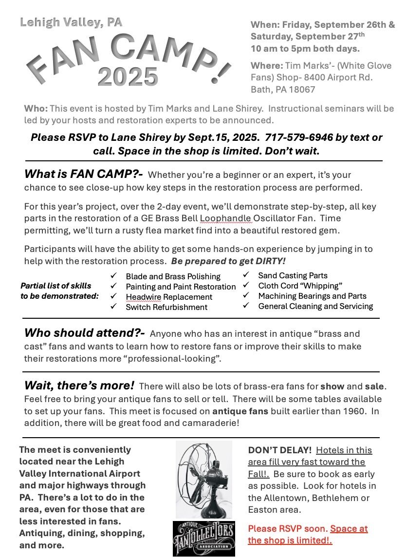 This event is a 2-day, instructional fan restoration camp. Learn to restore fans, improve your restoration skills, or lend a hand to show others if you're an expert!!
