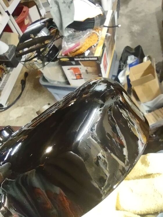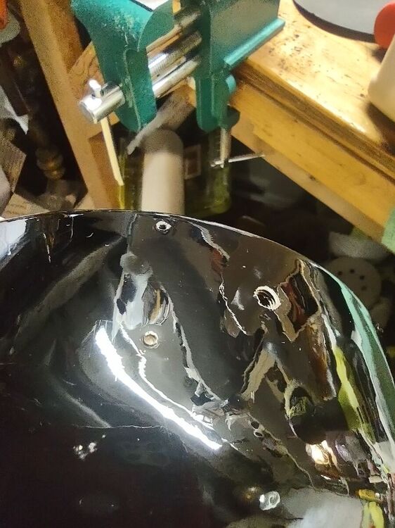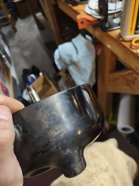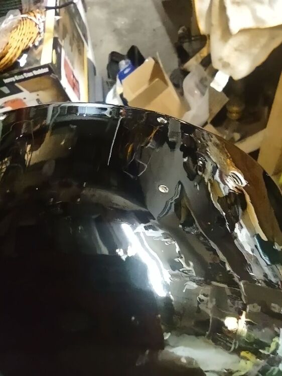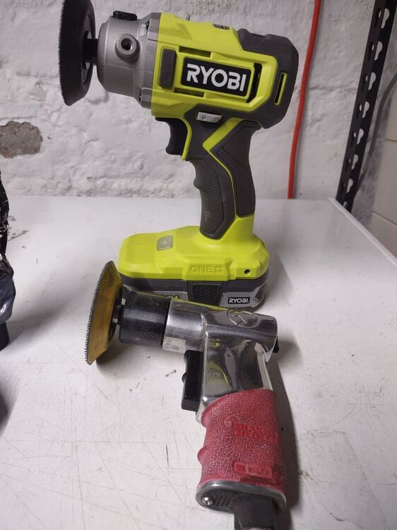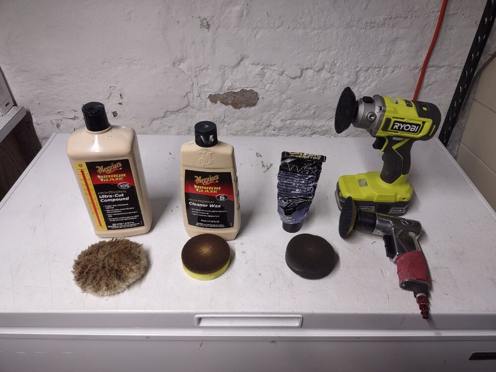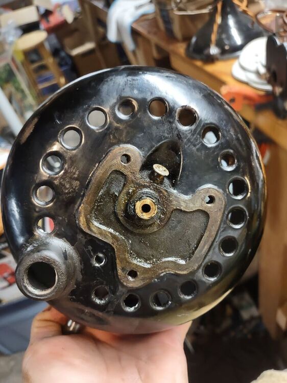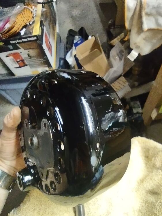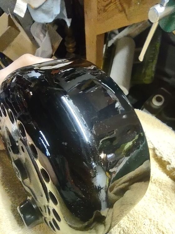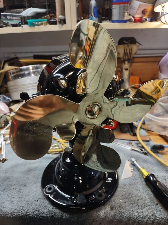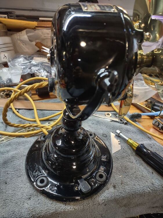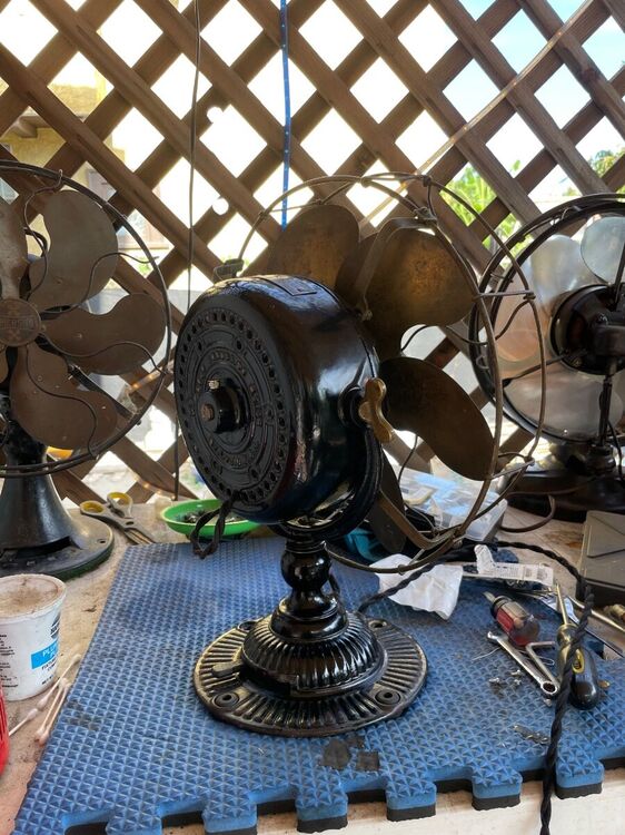 I've had this 21666 for a while now and decided it was time to bring it back to life. No paint job here! Most of the original Japan was intact and in good shape. Several friends have seen my other preservations of original finishes, so I decided it's time for a thread on my methods of preservation. I'm not going to get into how to take apart the fan, how to wire it, blah blah blah. There's a thousand great posts already made on those topics. This is just how to bring that original finish back to life along with a couple other topics thrown in along the way. This will be an on going post until the fan rejoins it's 6 wing brethren in the living room. But today I'll get into cleaning up the finish. Normally I do this with an air buffer, but as it's been cold out, I decided to try out a battery buffer by Ryobi. I like it. It's a bit heavier than an air buffer, with the need for a battery, but works pretty well. And it came with the 3 pads I always use for doing this. I used Meguiar's products on this example, but I've also used Chemical Guy's products with great results. After blowing the fan apart, I clean off any hardened grime with acetone. This works on the older, more durable Japan finishes. I avoid it on later fans. Starting with a wool pad, I start with the cutting compound. This does a great job at stripping light amounts of leftover grime, oxidation, and light scratches. On older Japan, you can get pretty aggressive with a low chance of damaging the finish. Newer paints you need to be cautious with. You can burn through the paint easily. Use a lighter compound, or just jump to the next step (which I usually do). One nice thing I like about the compound is that it strips rust and will leave you with bare metal. Here's the results of the compound: Next I'll load a foam correction pad onto the buffer and go to town with a cleaner wax. This is usually the step I'll start with on later painted fans. It gets rid of oxidation and fine scratches (and get rid of marks from the previous compound). It also works good as a cleaner for light grime. I'll also use the cleaner wax on a Dremel to get down in the vent holes. Getting there! The cleaner wax does leave a wax protective layer behind and it's totally cool to stop here. But I go one step further for added depth to the gloss. Using a soft foam pad, I apply wax. Here I use Meguiar's Black Wax for dark paints, but any good quality wax is acceptable. Buff that wax in and LET IT HAZE. This means let it dry! Go do something else. Go pick out your wire or look for that shrink tube you know you bought last weekend and now can't find... You'll come back to this: Now buff that out with a microfiber and you'll end up with a beautiful original finish that is well protected and easy to keep clean! You can see a spot of paint loss on the side of the housing. Some guys touch this up, I leave it alone. The camera makes it look whiter than it actually is. It's raw cast iron, it's a dark grey. But the main objective here was to bring back a beautiful gloss to totally original paint. You could do all of this by hand, but it'll just take a lot longer. Small parts I typically do by hand. Stay tuned to this thread... You'll see me buff the brass and rivet the wings back on the hub. I'll also show using liquid gun bluing on steel fasteners. I'm in no way calling all of these methods my own or even the best. They are just what I do to achieve the look I like. I've learned some of these methods from other people, reading former postings, and just trying new stuff out to see what the results yield. I just want to show others that my methods aren't difficult and anyone can do it! Edit: Apparently Meguiar's Black Wax has been discontinued. I've got some Chemical Guys Black Light Hybrid Radiant Finish on order as a replacement.