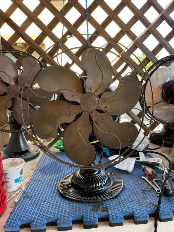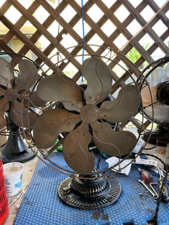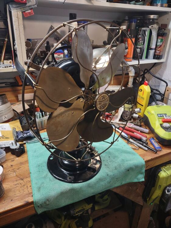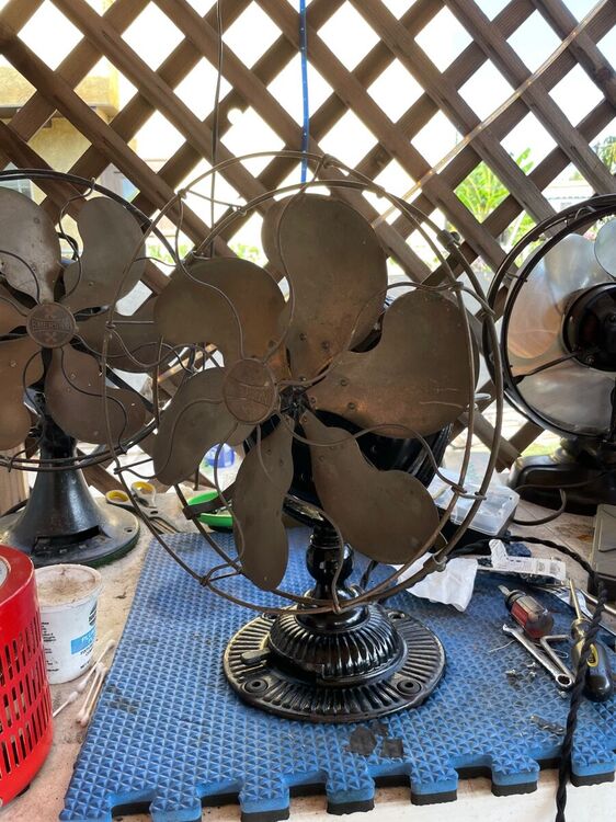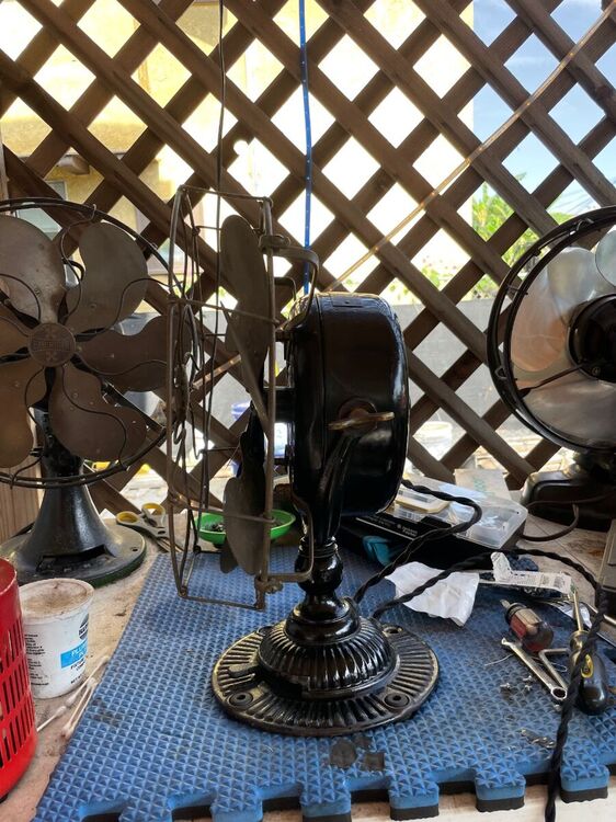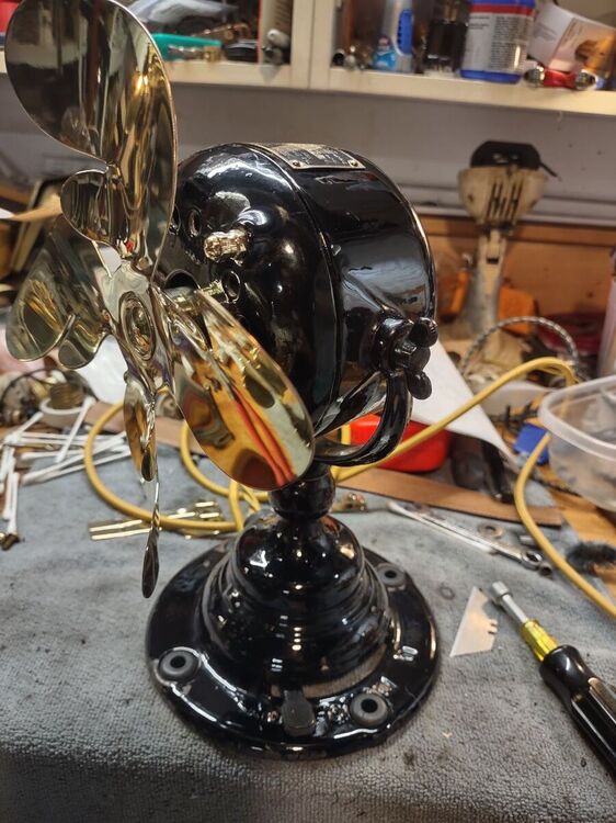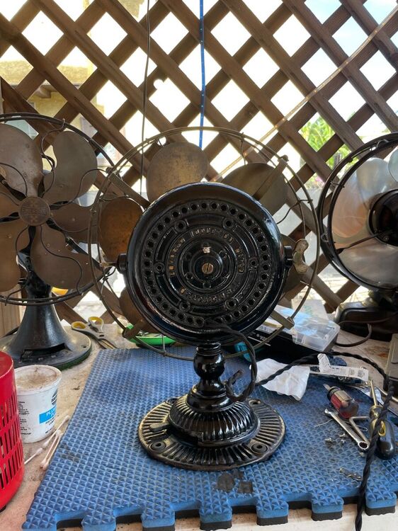 I got this in an estate auction. And, Daniel O’Toole, a good fan dude, did me a solid and picked it up and mailed it to me. Big thanks to Dan! I replaced the head wire and power cord. I only had to fabricate one piece, the insulating washer on the inside of the motor case that the centrifugal start sits on. I just took a heavy piece plastic sheet cut it to size and painted it with insulating varnish. Other than that just some elbow grease, lube, and a good cleaning inside and out. It’s all original. I’m considering polishing the brass but the patina looks good to me and I’ll just leave it as is for now. There is only a slight difference in the 2 speeds. I’ve been running it on a Variac at 104 volts. The base has some paint loss but I don’t mind a little bit of rust. I think it gives it character. IMG_3264.MOV